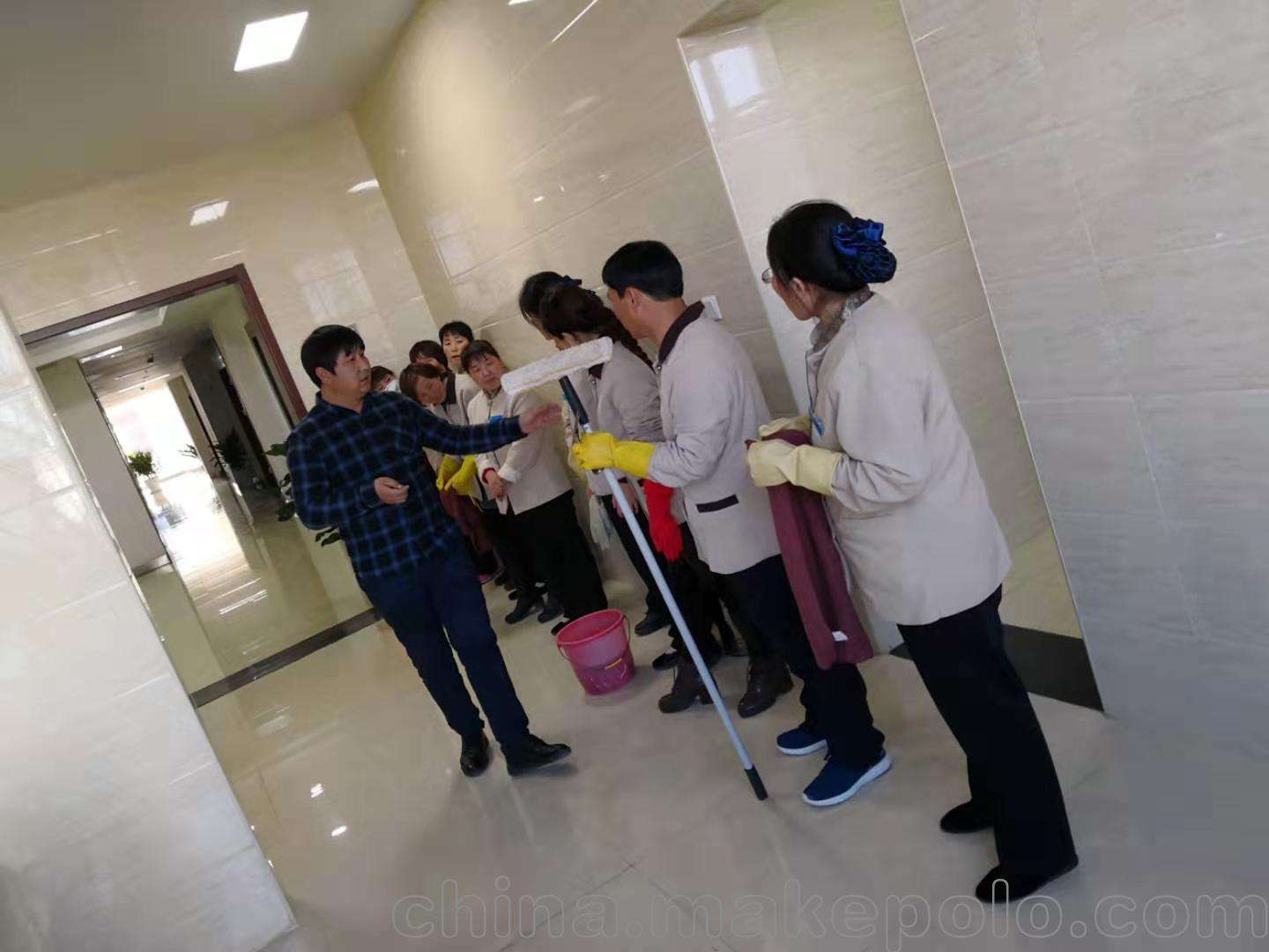 (9)、清潔衛(wèi)生間時(shí)應(yīng)在門(mén)口豎立“正在清潔”指示牌,以便客戶注意并予以配合。保潔人員應(yīng)注意自我保護(hù),保潔時(shí)戴好橡膠手套,預(yù)防細(xì)菌感染,防止損害皮膚。清潔完畢,應(yīng)注意洗手。