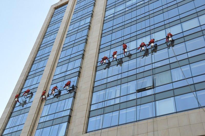 我們除了采用傳統的清洗座板,安全繩比普通吊繩厚度高出2mm以外,還會根據現場的實際情況,采用吊籃和曲臂吊車,以此來保證清潔效率以及保障施工人員的安全問題。
